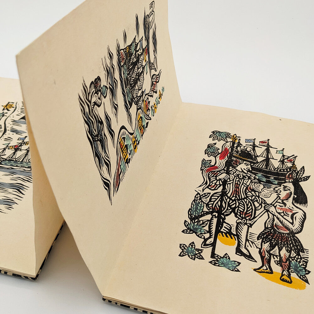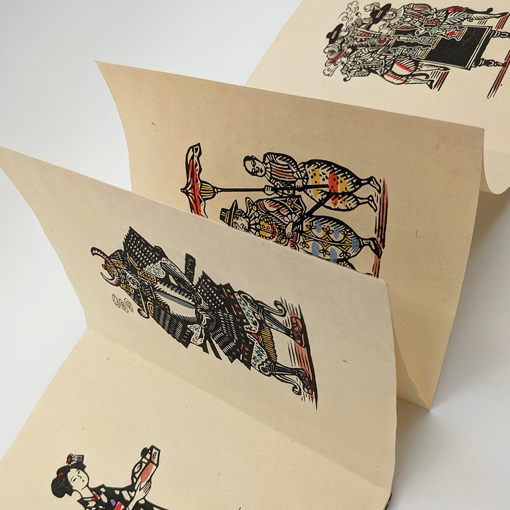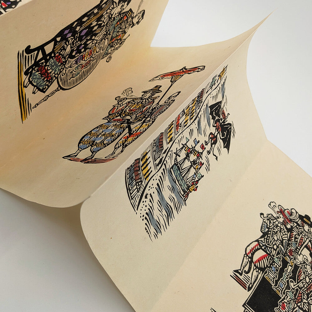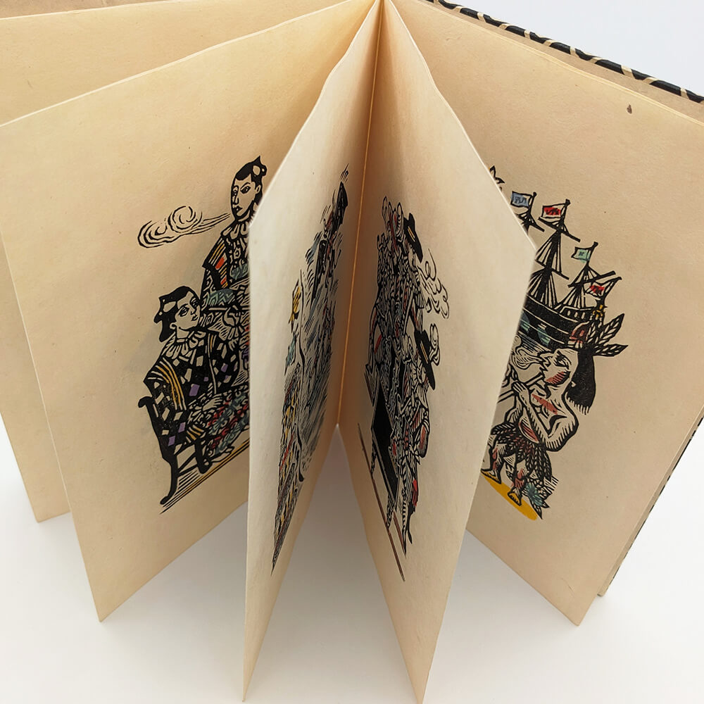 1 livre de 165x235mm dépliant en accordéon composé de 10 gravures sur bois peintes à la main avec 2 plaques de bois peintes à la main en couverture. Pochette imprimée d’origine qui recouvre le livre.