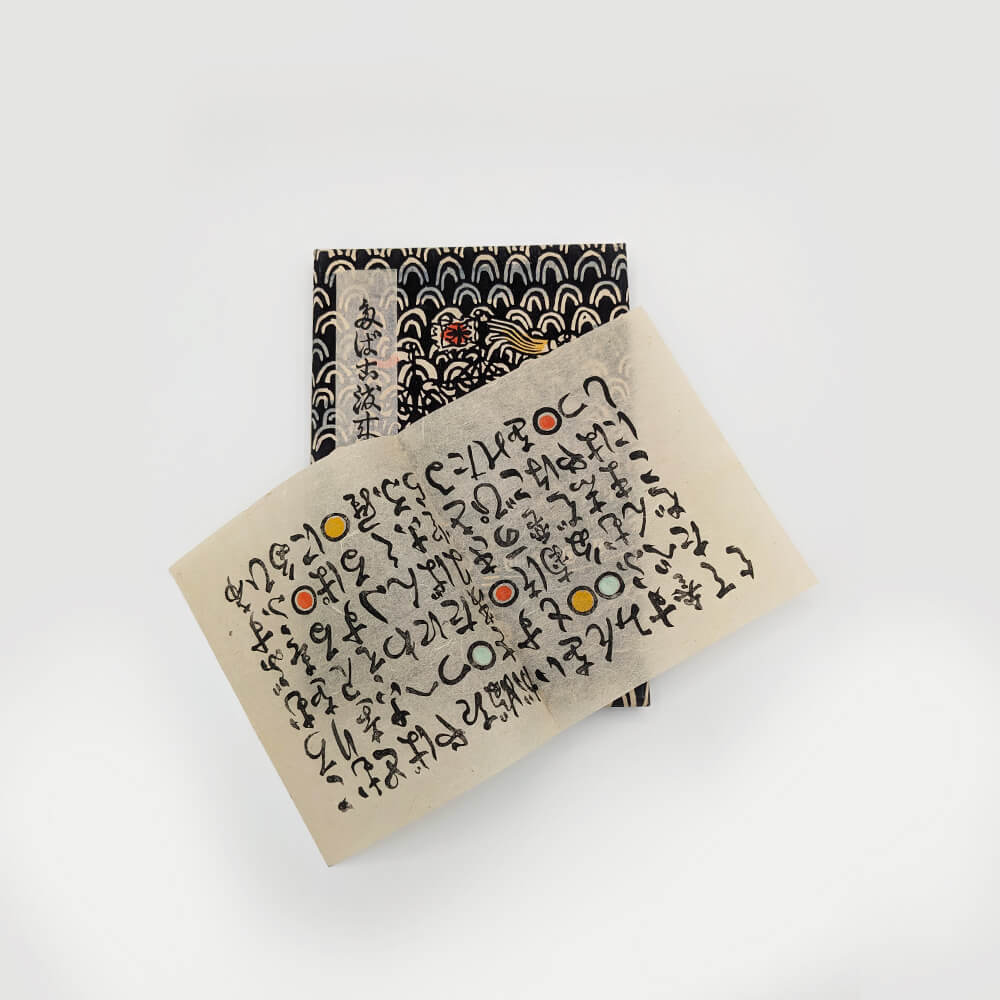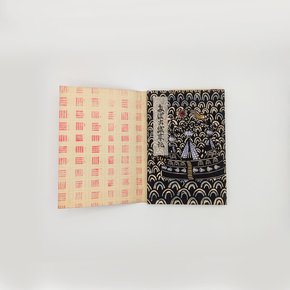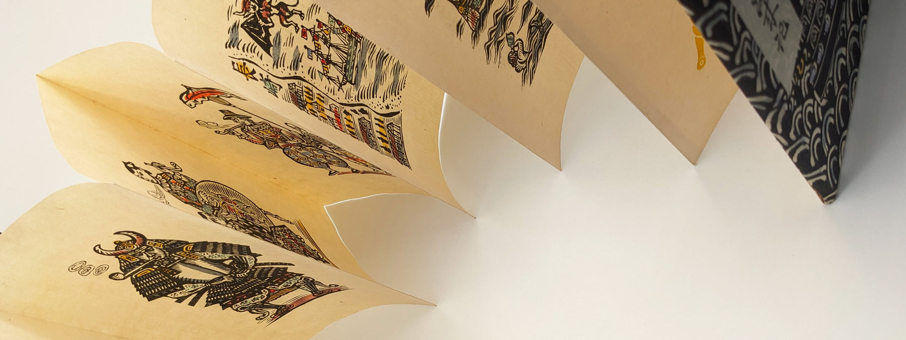1 livre de 165x235mm dépliant en accordéon composé de 10 gravures sur bois peintes à la main avec 2 plaques de bois peintes à la main en couverture. Pochette imprimée d’origine qui recouvre le livre.