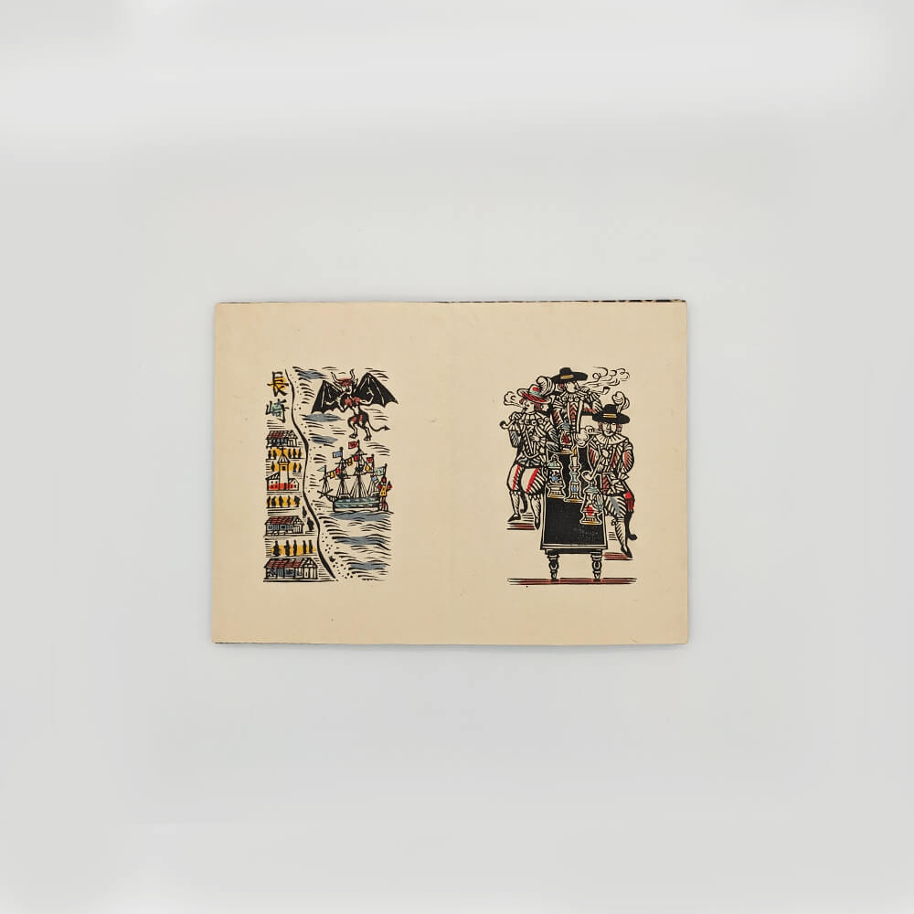 Kawakami travaille son style marqué par la période Meiji Kaika et la période Nagasaki Nanban. Son style de dessin primitif, rustique, et sa palette de couleur vive et restreinte dégagent une grande poésie, nostalgique d’univers passés très expressif. Ce livre fait partie d’un ensemble de livres imprimés par l’artiste dans les années 40 sur le thème Nanban.