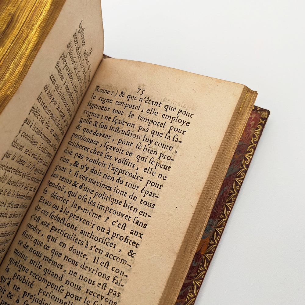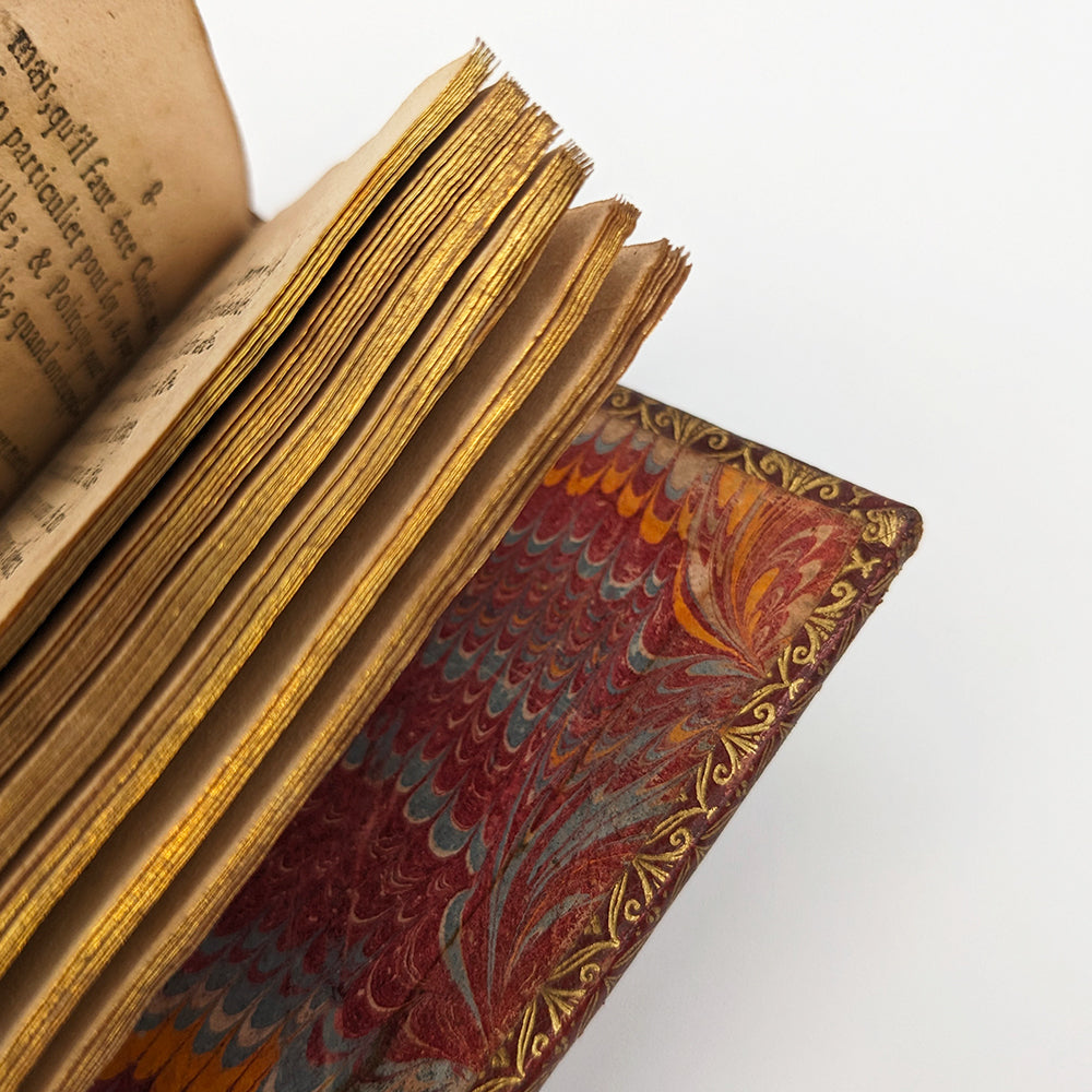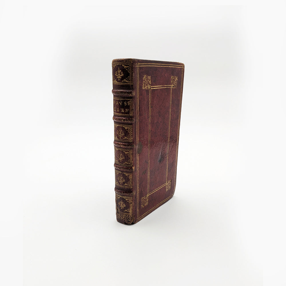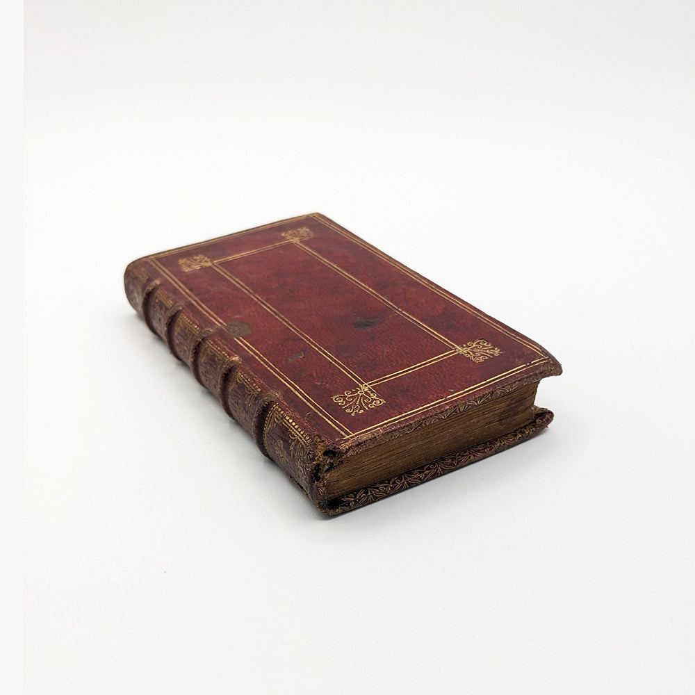 In-12 de 154x90mm. Plein maroquin rouge du XVIIème, dos à cinq nerfs avec caissons doré et pièce de titre dorée. Roulette dorée sur coupe (bord des plats extérieurs) et chasse. Plats avec encadrements filaires dorés et quatre fleurons sur les coins. Tranches dorées, papier marbré sur contreplat. Garde blanche, (premier livre) page de titre, feuillet liminaire 3ff. (dédicace au roy), préface 1f. 5-126pp. (second livre) Page de titre, préface 1f. 130pp. Garde blanche.